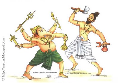 The first legend (in the Brahmanda-Purana) is related to a battle between Ganesh and Parashurâma. Parashurama was one of the Vishnu incarnations (avatara), born on earth to teach wisdom to the governing class, the Kshatriya , who had become arrogant and oppressed people. Parashurama meditated on Shiva and got the divine axe, Parashu. This axe helped him to fight against all the corrupted princes, inspired by devils.